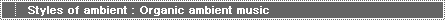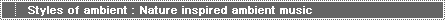 of ambient : music * Organic ambient music * Nature inspired ambient music * Isolationist ambient music * Ambient electronic music * Ambient dub * Ambient groove |