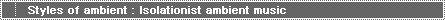 | Isolationist ambient music is perhaps the darkest, least accessible of ambient music. Inspired by industrial music, noise music, and classical music, isolationist may be rather dirge-like: more repellant than inviting. The Sombient label is the primary purveyor of isolationist ambient, in particular with the "drones" compilation series. Some of the artists known for this style of ambient music include Robert Fripp, Vidna Obmana, Jeff Greinke, and Naut Humon. | |||||||||